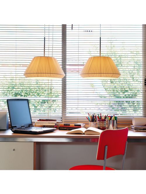 Die Bover Mei 38 ist eine Pendelleuchte mit einem textilem Leuchtenschirm aus Wickelplissee und einem transparenten Kabel. Der Leuchtenschirm ist in mehreren Farben erhältlich.