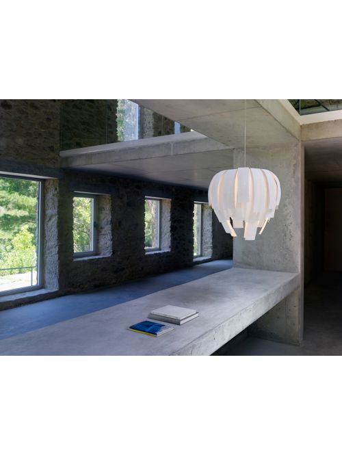 Der Leuchtenschirm der Arturo Alvarez Luisa LS04G besteht aus sich überlappenden Schichten eines lackierten Edelstahl-Metallgeflechts, das in den Oberflächen weiß und grau angeboten wird. Auf Anfrage ist die Leuchte auch in taupe und beige erhältlich. Das transparente Kabel dieser Pendelleuchte ist bei Bedarf kürzbar. Das Licht der Leuchte fällt durch die Streifen hindurch und erzeugt so ein angenehmes Raumlicht. Die Luisa LS04G des Designers Arturo Alvarez besitzt einen Durchmesser von 45 cm und eine Höhe von 50 cm. Diese Pendelleuchte ist sowohl als E27- als auch als LED Version erhältlich. Die E27-Version hat eine E27 Fassung und wird mit einer austauschbaren LED Retrofit betrieben. Die LED Version der Luisa LS04G hat eine integrierte LED mit einer Farbtemperatur von 2.700 Kelvin extra warmweiß. Die LED Pendelleuchte gibt es auf Anfrage auch als DALI dimmbare Version. Zudem wird auf Anfrage auch eine LED Version mit einer Farbtemperatur von 3.000 Kelvin warmweiß angeboten.