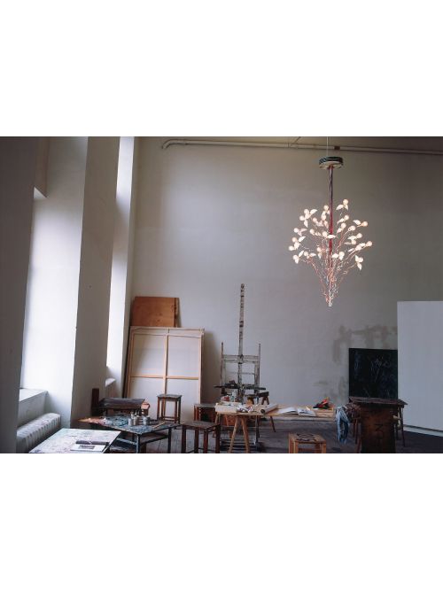 Die Ingo Maurer Birds Birds Birds ist ein außergewöhnlicher Kronleuchter aus der Birdie Serie. Die Größe und Form dieser Leuchte ist durch Drehen, Biegen und Strecken der Arme veränderbar. An den Fassungsenden der 24 Aluminiumdrähte sind die unverwechselbaren Flügel aus Gänsefedern befestigt, die an einen Schwarm aufsteigender Vögel erinnern. Der bauseitig dimmbare Transformator ist im Deckenbaldachin integriert. Die Anschlusskabel werden in blau/rot oder transparent angeboten. Dieser Kronleuchter verwendet spezielle LED Leuchtmittel, die nur in Leuchten der Birdie Serie eingesetzt werden können. Der Kronleuchter wird mit vierundzwanzig 1,5 Watt LED Leuchtmittel geliefert. Die Birds Birds Birds ist in drei Längen erhältlich: mit einer Standardlänge von 190 cm, mit einer Länge von 130 cm für niedrige Raumhöhen oder mit bis zu einer Länge von 300 cm für hohe Raumhöhen.