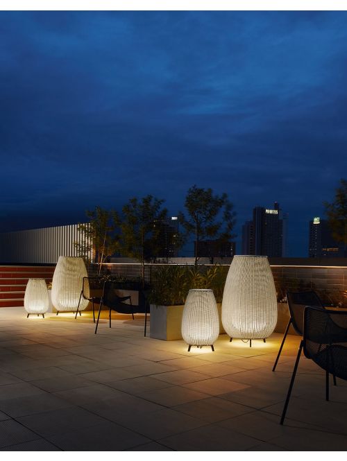 The belly-shaped lamp body of the Bover Amphora 02 is braided by hand and consists of polyethylene. This floor lamp with a diameter of 80 cm and a height of 123 cm is suitable for both indoor and outdoor use. The rattan-look lamp has a 390 cm long, black cable. The Bover Amphora 02 floor lamp is available in light beige or brown and can be operated with LED retrofit lamps. The light of this floor lamp shines through the wickerwork of polyethylene. Thanks to the IP66 protection class used, this floor lamp is weatherproof and protected against UV radiation. The three-legged base of the Amphora 02 from Bover is provided with a brown oxidation protection against corrosion.