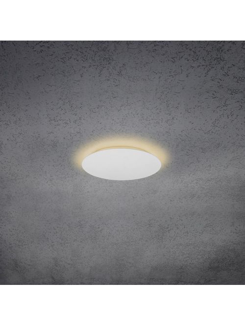The Escale Blade 34 cm can be mounted on the wall or ceiling. Its lamp shade has a diameter of 34 cm and a depth of 3.5 cm. The lamp radiates its light to the ceiling or wall, from where it is reflected, creating a halo effect around the lamp. The Blade 34 cm is available in white matt, black matt, silver matt anodised, concrete look, gold leaf, taupe anodised and anthracite finishes. An LED is integrated as a light source.