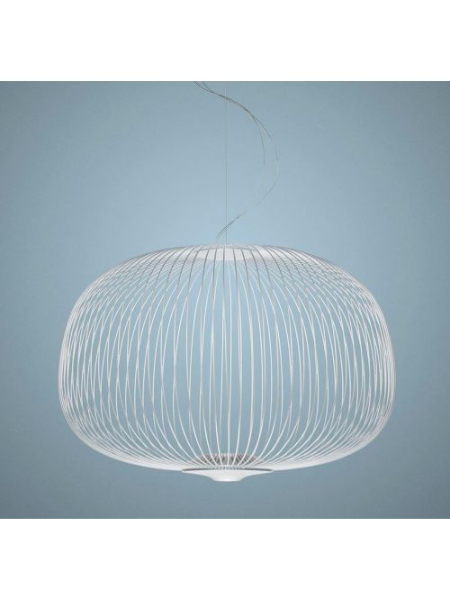 The Foscarini Spokes 3 pendant lamp has a diameter of 61 cm and a height of 42 cm. Its lamp shade consists of thin metal spokes made of round steel tubes, which are vertically fixed. The light is emitted directly downwards by the pendant lamp. At the same time the lamp is also illuminated, creating a play of light and shadow on the lamp shade. The Spokes 3 is operated with two LEDs. The electrical supply line is transparent and not visible from the outside, as it runs along a spoke in the lamp shade. The pendant lamp is available in white, copper, graphite, black and gold. It is available in a non-dimmable and a DALI dimmable version. The DALI dimmable version can also be dimmed with Push. In addition, the pendant lamp is also offered as a MyLight lamp, which can be dimmed with the Casambi App via Bluetooth using a smartphone or tablet. The cable has a maximum length of 340 cm and can be shortened if necessary. On request, the Spokes 3 is also available with a longer cable.