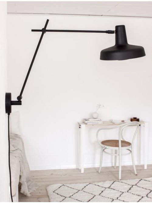The Grupa Arigato Wall has a rotating and swivelling jointed arm. The jointed arm consists of two parts, each with a length of 35 cm. The lamp shade can be rotated by 360 degrees and swivelled by 125 degrees. At the bottom of the shade is a diffuser, thanks to which the light is emitted downwards without glare. The shade diameter is 22.8 cm. The Arigato wall lamp can be connected via a provided supply line or directly to a wall connection. An on/off switch is integrated on the wall mount. The Arigato Wall by Grupa is offered in the surfaces black or white matt powder-coated. On request, it is also available in other finishes. The lamp can be operated with an E27 halogen lamp or LED retrofit. Wall lamps with two jointed arms, with a longer jointed arm or a simple lamp arm are also available from the series.