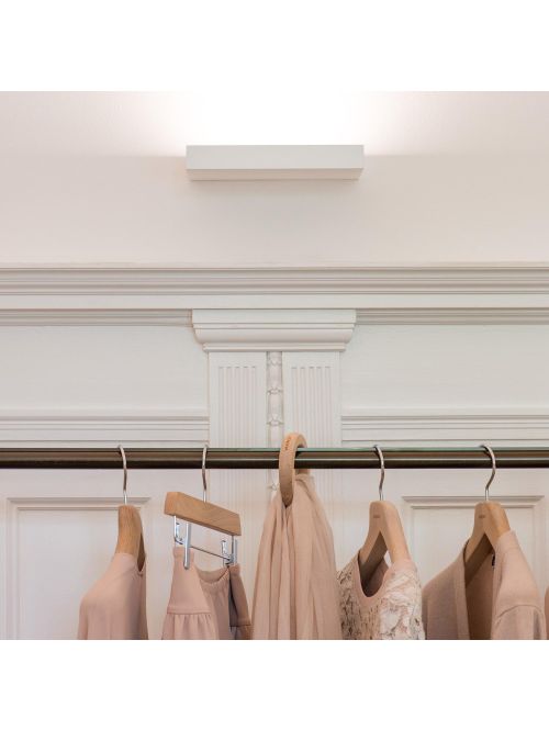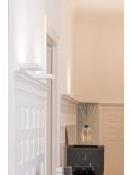 The Mawa One Piece 9 wall lamp radiates its light upwards to the ceiling and to the wall behind it. The light illuminates the ceiling evenly and glare-free and is also reflected into the room. The lamp is 20 cm deep and has a width of 36 cm. On top of the lamp there is a printed cover made of borosilicate glass integrated, which provides a soft light gradient. The ceiling floodlight is manufactured in folding technique from a single piece of aluminum and is available in the powder-coated surfaces white matt and dark bronze. The One Piece 9 is operated with an integrated LED, which has a colour temperature of 2700 Kelvin extra warm white. On request, the lamp is also available with a colour temperature of 3,000 Kelvin warm white or 4,000 Kelvin white.