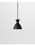 The Nyta Pretty Long pendant lamp emits its light directly downwards as a narrow cone. It has a diameter of 16.4 cm and a height of 33.7 cm. The lamp is available in black glossy, black matt, white glossy and white matt. All versions are made of steel and, depending on the choice of surface, either glossy or matt lacquered. These shades are made from a single piece of steel in an elaborate craftsmanship process. The both black versions have black cables and canopies. The two white versions are supplied with white cables and canopies. The cables are each up to 300 cm long and can be shortened if necessary. On request, the lamp is also available with 500 cm long cables. The pendant lamp can be dimmed on site and can be operated with LED retrofit lamps or halogen lamps.
