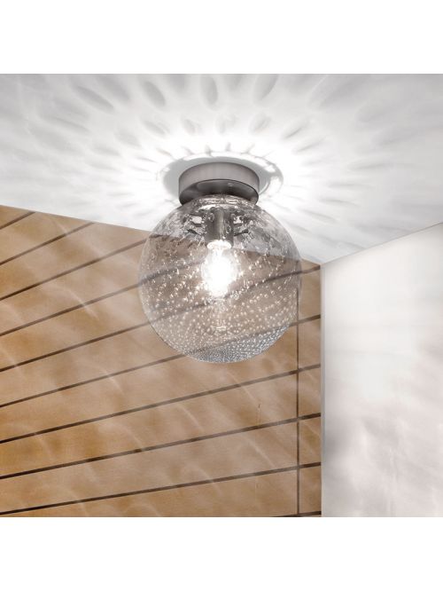 The Vistosi Bolle PL G is a ceiling lamp with a shade made of mouth-blown crystal glass. The baloton technique is used for the processing, whereby air bubbles are enclosed into the glass for a special texture. This texture multiplies the reflections on the surface of the shade and creates a halo effect on the ceiling around the lamp. The Bolle PL G ceiling lamp is available in crystal transparent and white. The metal parts of the lamp are satin nickel-plated in both versions. This light can be operated also with E27 LED retrofit lamps.