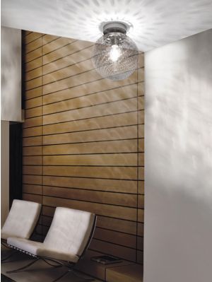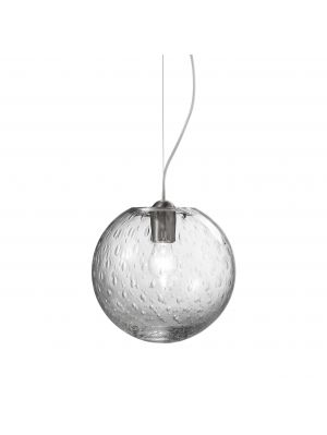 The Vistosi Bolle lamp family comprises four pendant lamps, a table lamp, a ceiling lamp and a wall/ceiling lamp. All lamps of this series have a lamp shade made of mouth-blown crystal glass. The glass is treated with the Baloton technique, in which air bubbles are inserted into the glass. This gives the lamp shade a special texture which multiplies the reflections on the surface of the glass. This creates for some of the lamps a halo effect on the wall, ceiling or table. All lamps are available with transparent or white crystal surfaces. The Bolle SP pendant lights are offered with diameters of 16 cm, 25 cm, 35 cm and 45 cm. Some are offered with a decentralisation kit that allows them to be mounted independently of the power outlet. The Bolle FA P can be used as a wall or ceiling light. Some of the lights in this series are available in halogen and LED versions.