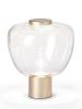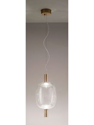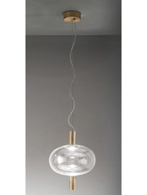The Vistosi Riflesso lamp series comprises a table lamp and three pendant lamps. The table lamp Riflesso LT 3 has a lamp shade made of mouth-blown and hand-made crystal glass. The shade is available in transparent crystal and bright amethyst. The base is offered in copper satin finish and brass gold satin finish. A metal element is integrated at the top of the shade, which is supplied in the same surface as the lamp base. The table lamp has an on/off switch on the supply line. The three pendant lamps of this series have differently shaped lamp shades made of mouth-blown crystal glass. They are also available in various shade colours. Metal elements are attached to the top and bottom of the Riflesso pendant lamps. These are offered in gold satin brass or copper satin. The cable of the pendant lights can be shortened if required. All lights of the series are operated with an integrated LED, which has a colour temperature of 3,000 Kelvin warm white.
