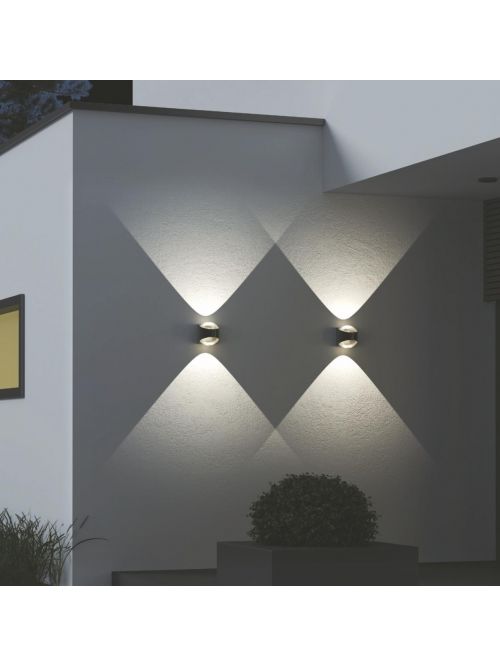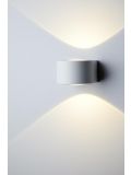 The Loom Design Saga wall lamp with IP65 protection is also suitable as an outdoor lamp. The light is focussed upwards and downwards through lenses and emitted in light cones onto the wall. Clear, spherical glass is integrated above and below the lenses.